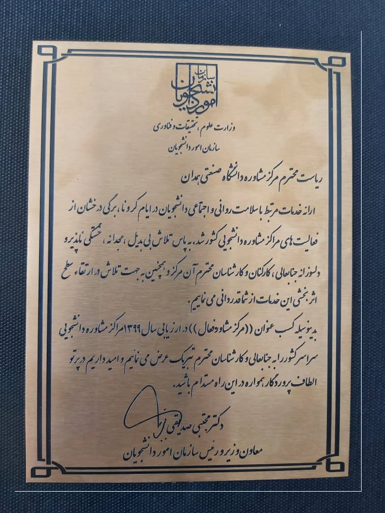 کسب مقام مرکز مشاوره فعال کشوری در سال 1399 با دریافت تندیس از وزارت علوم ٍ تحقیقات و فناوری